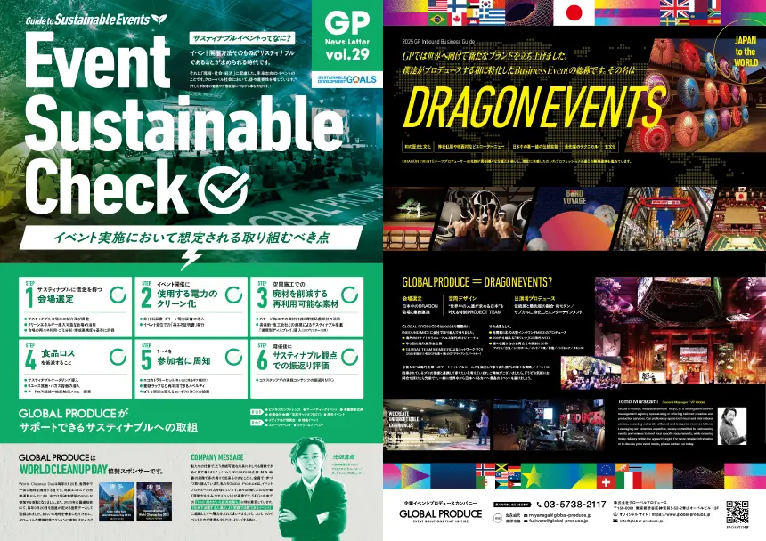 イベント実施におけるサステナブルな取り組みや、GPを引っ張るリーダー陣と最新のトレンドが詰まったGPジャーナル、GPが取り組んでいるDRAGON EVENTSのご紹介など盛り沢山にお届けします。