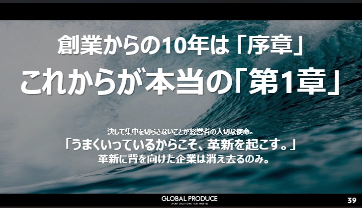 初めに代表の光畑から業績共有を始め、「創業10年目」を経てのこれからのGPとしてのあるべき姿の全体共有のプレゼンテーション。