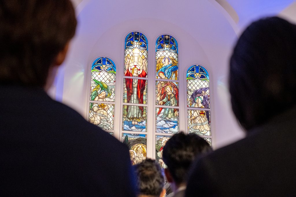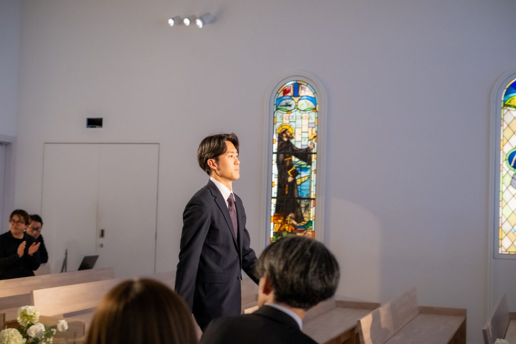 チャペルの扉が開き、新入社員が一人ずつ入場します。通るのはバージンロード。結婚式用の道というイメージが強いですが、これまでの過去・現在・これからの未来という人生を表す神聖な道のことでもあります。この道を歩くという体験は、新しい世界に飛び込む新入社員にとってふさわしい入場演出ですね。