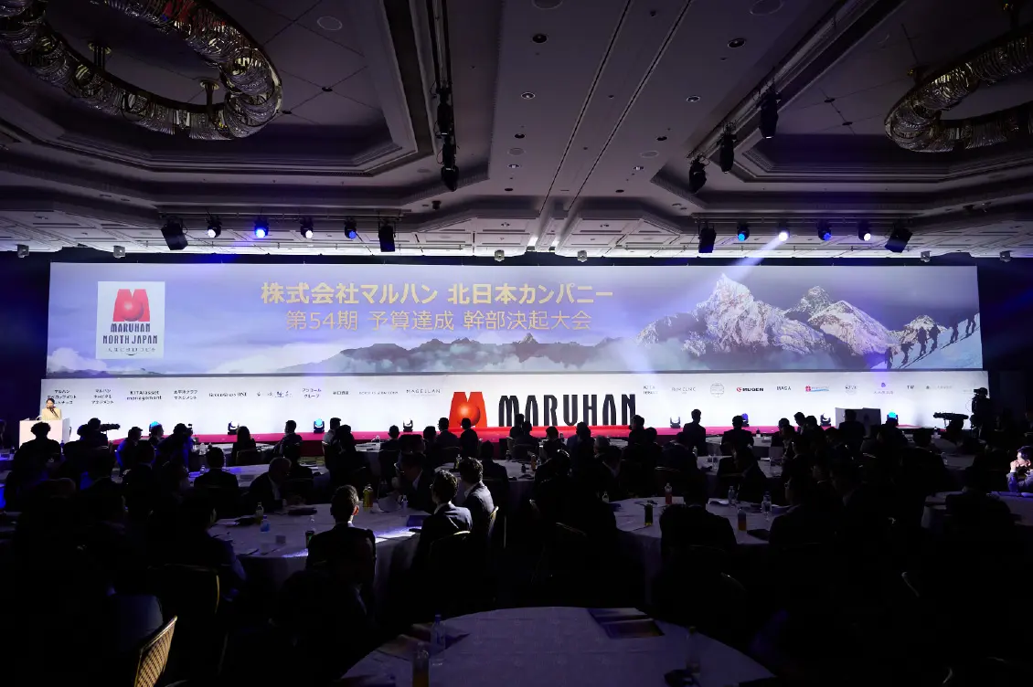 株式会社マルハン北日本カンパニーは予算達成決起大会(キックオフ)を開催しました。来期方針や目標の伝達、前期結果の振り返り、事業活動を通じた表彰といった定番のプログラムに加え、全従業員で構築したカンパニーイズムの発表で従業員エンゲージメントの向上とモチベーションアップを図るべく、視覚的なインパクトの大きい巨大スクリーンを採用。また、表彰者はレッドカーペットを歩いて登壇するなど、細部までスケール感、高級感、ワクワク感のあふれるキックオフを実現しました。