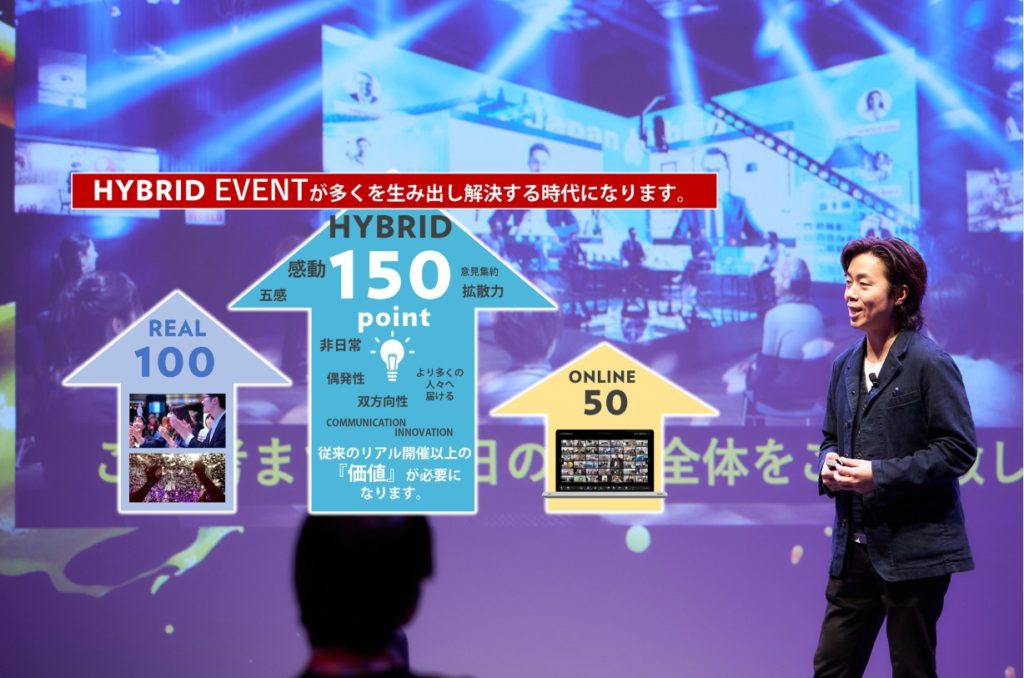 リアル開催とオンライン開催を組み合わせた方法で、リアル参加者とオンライン参加者の両方がいるのが特徴です。参加形式によって見える景色や得られる情報に差があるため、それぞれの参加者に合わせたコンテンツ、演出を練ることが求められます。