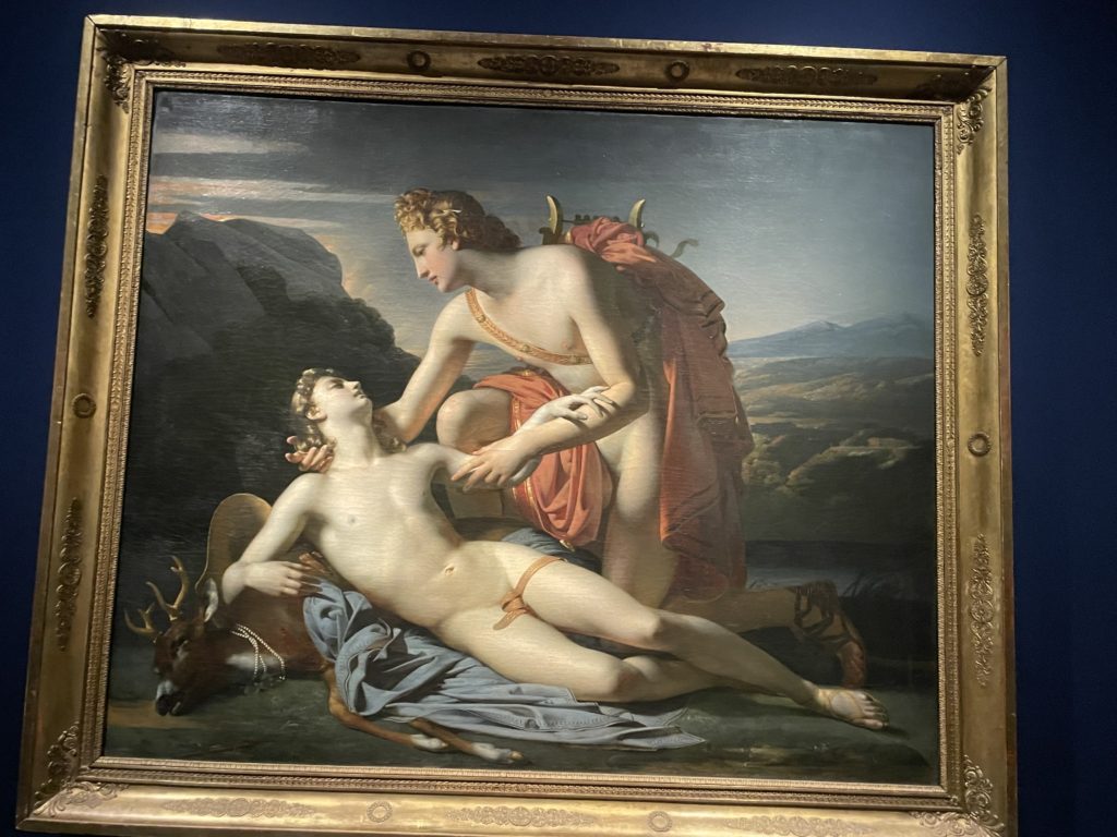 かわいがってた牡鹿を誤って槍で殺してしまったことで、生きる気力を失い永久に嘆き続けたいと哀願したキュパリッソスをアポロンが優しく支えている作品になります。