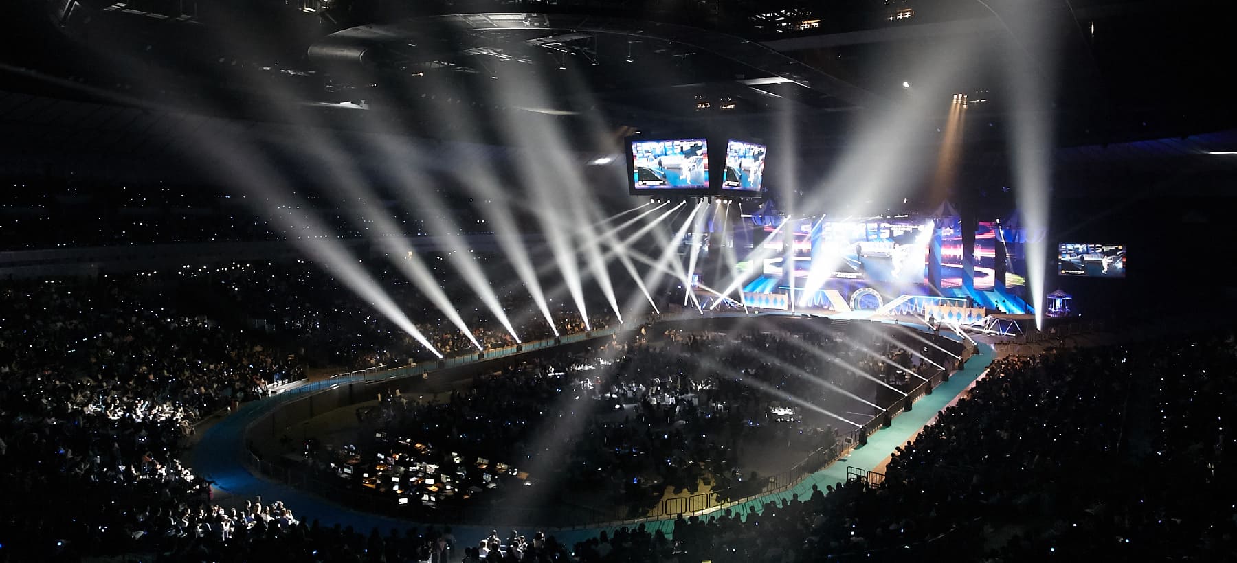 スクリーンは400インチ×3面で展開し、プロジェクションマッピングによって、会場前面を巨大なスクリーンとして使用。縦10m×横50mのダイナミックな映像を使った演出を行い、特別感を際立たせました。