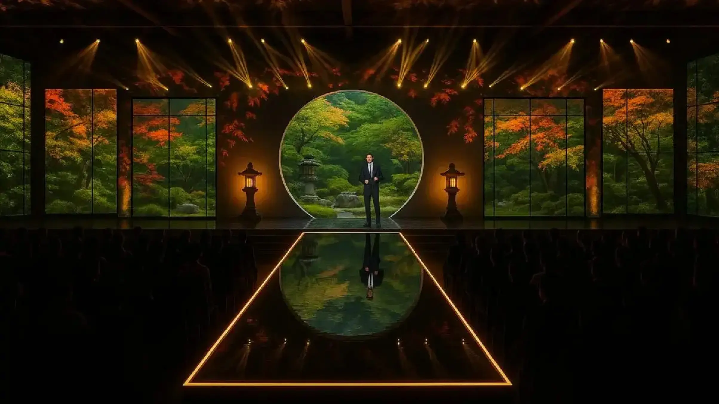 円窓の向こうに広がる庭園は、静かな水面のごとくランウェイに映り込みます。LED、灯籠、そして秋の色彩が織り重なり、日本の静謐な強さと時代を超えるリズムを表現しています。