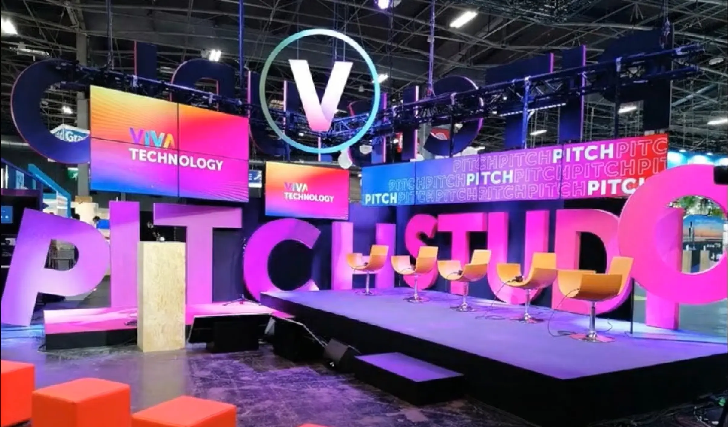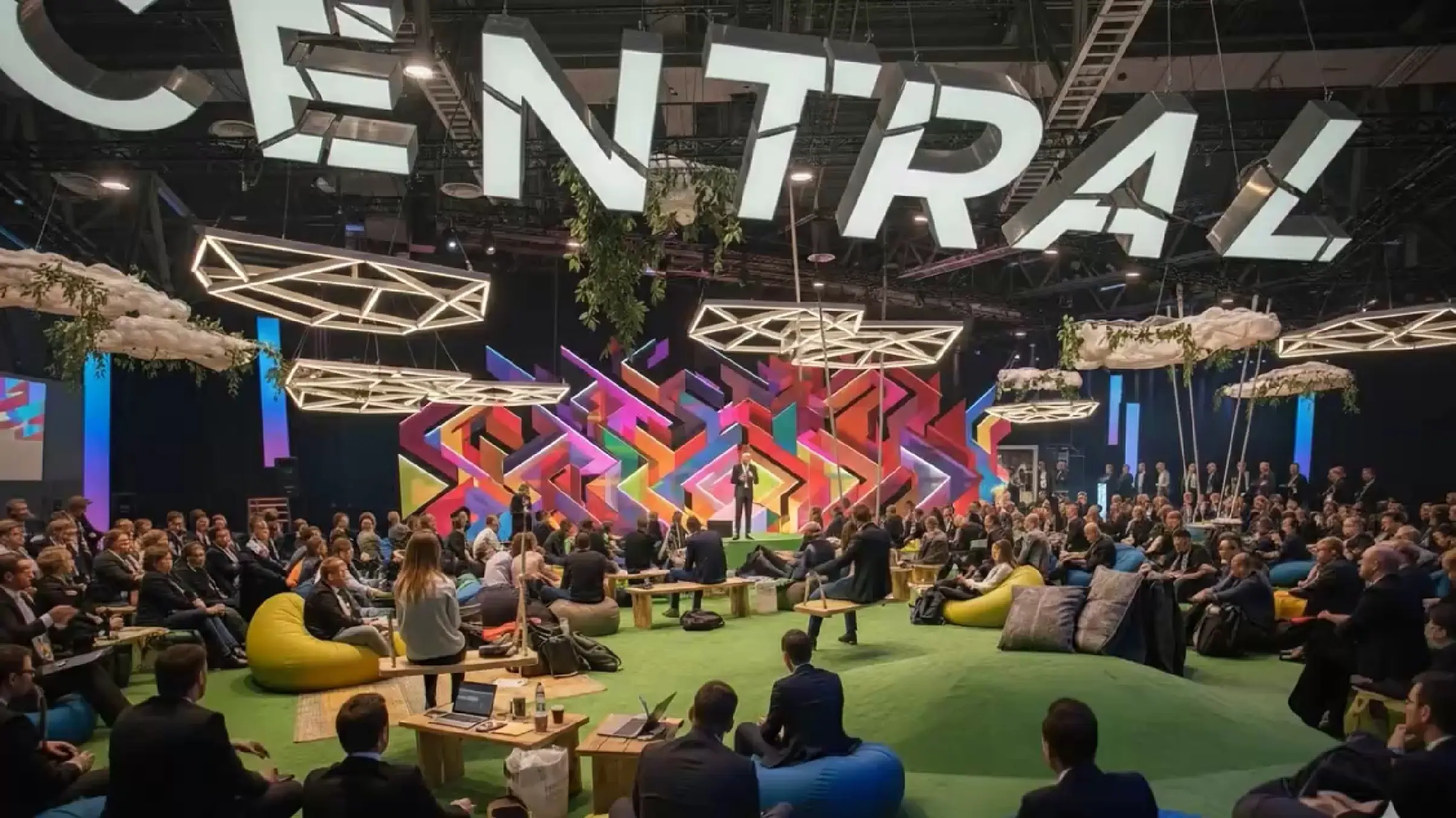 【AIパース】ヒューマンスケール感を活かした切り文字を設置し、ITの知性を感じさせつつ、色彩でユーモアを加えた空間設計。「今時感」をまとった、新しいITカンファレンスの舞台。