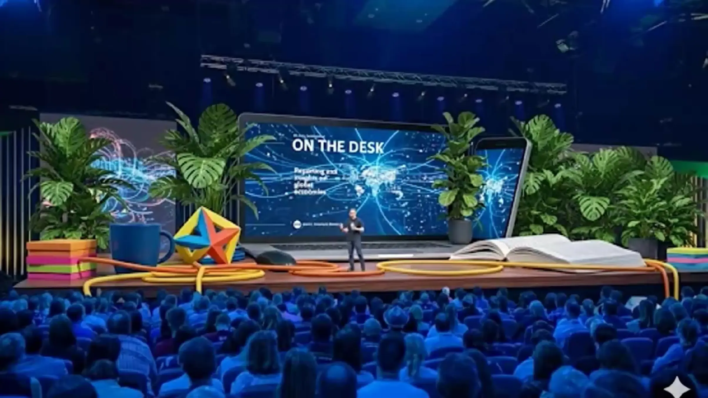 【AIパース】ステージをひとつの巨大なデスクに見立て、思考が生まれ、議論が交わされる“机の上”そのものを会場の中心に据えた。抽象的なアイデアが語られる場ではなく、実際に動き出す瞬間を「体感」できる空間として、強いコンセプトと明確なメッセージ性の両立を目指している。