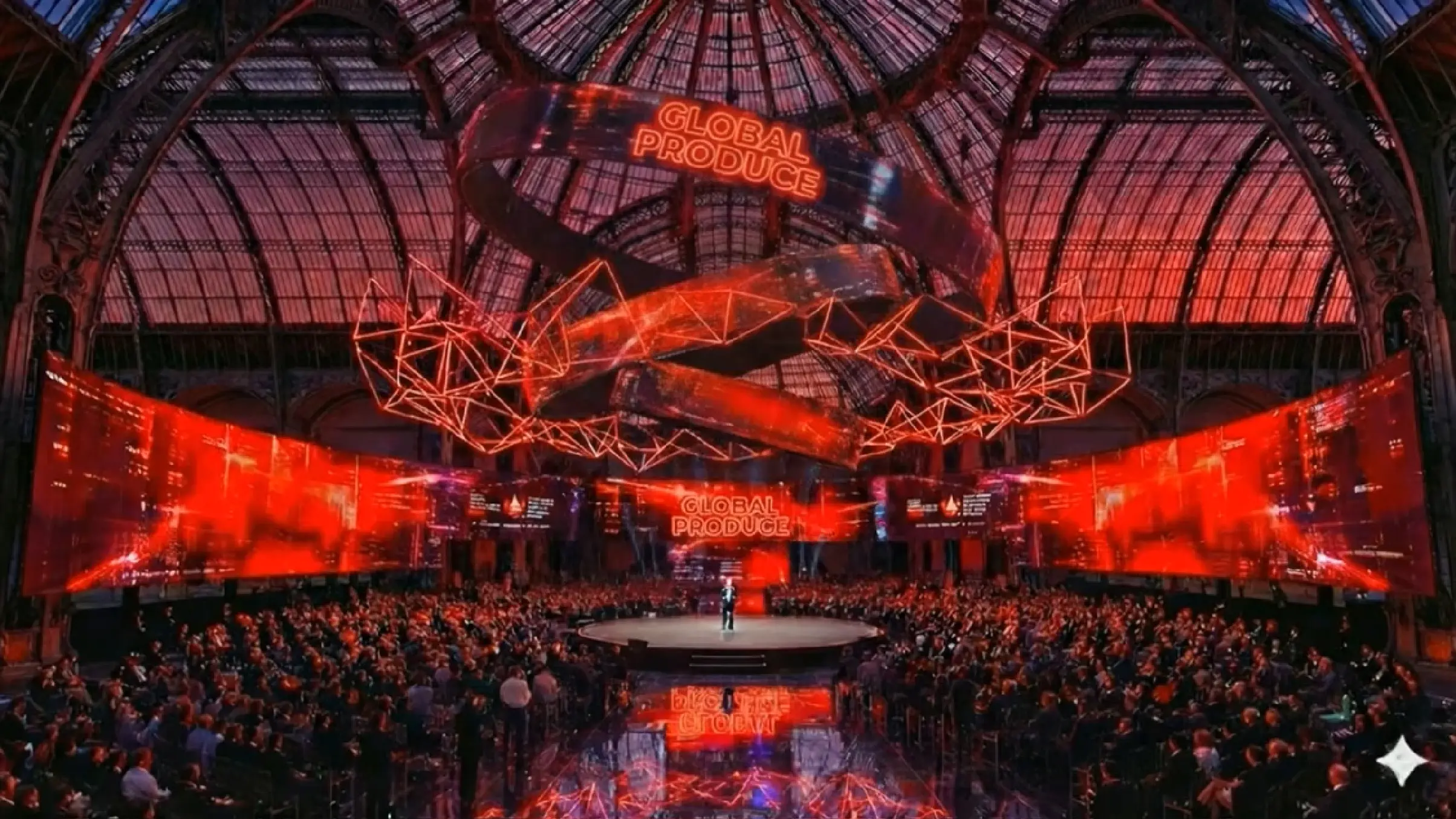 【AIパース】開放的なドーム空間とテクノロジーが融合した、圧倒的なスケールのイベントパース。会場を取り囲む巨大な曲面スクリーンと、天井から螺旋状に広がる光のオブジェが、情熱的な赤のライティングで会場を統一。観客を没入させる非日常的な熱狂と一体感を表現。