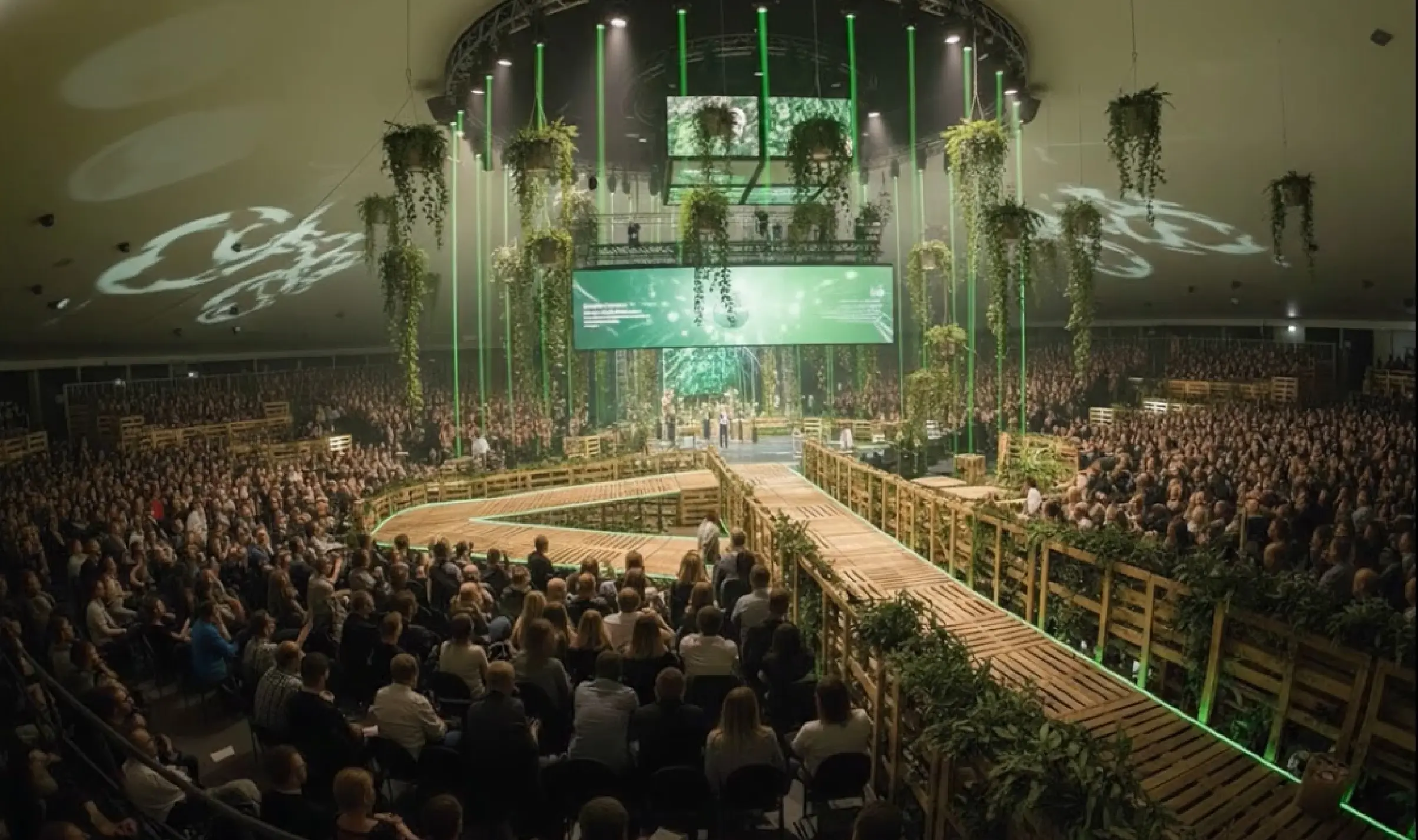 パレットを用いたサステナブルなセンターステージ、曲線状のランウェイが特徴。リアルとオンライン参加者を繋ぐ、次世代のハイブリッドファッションショー。座席位置によらず、高い視認性を確保した空間設計に。