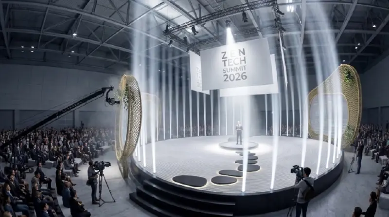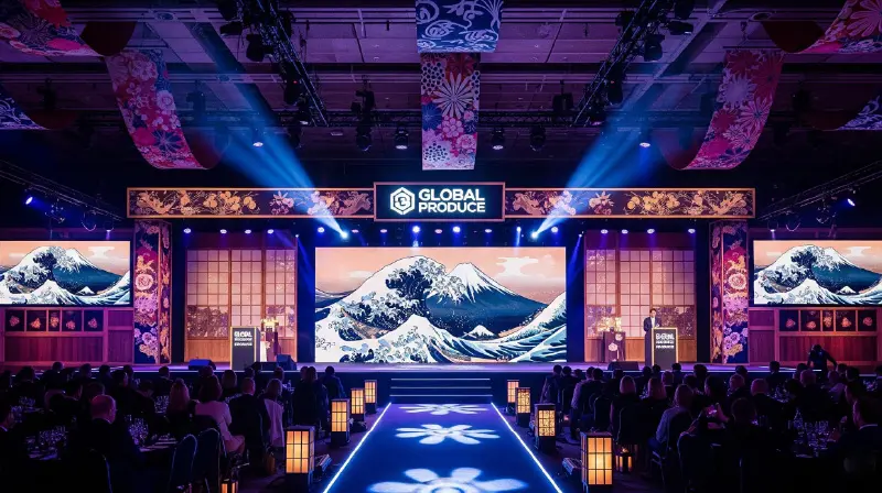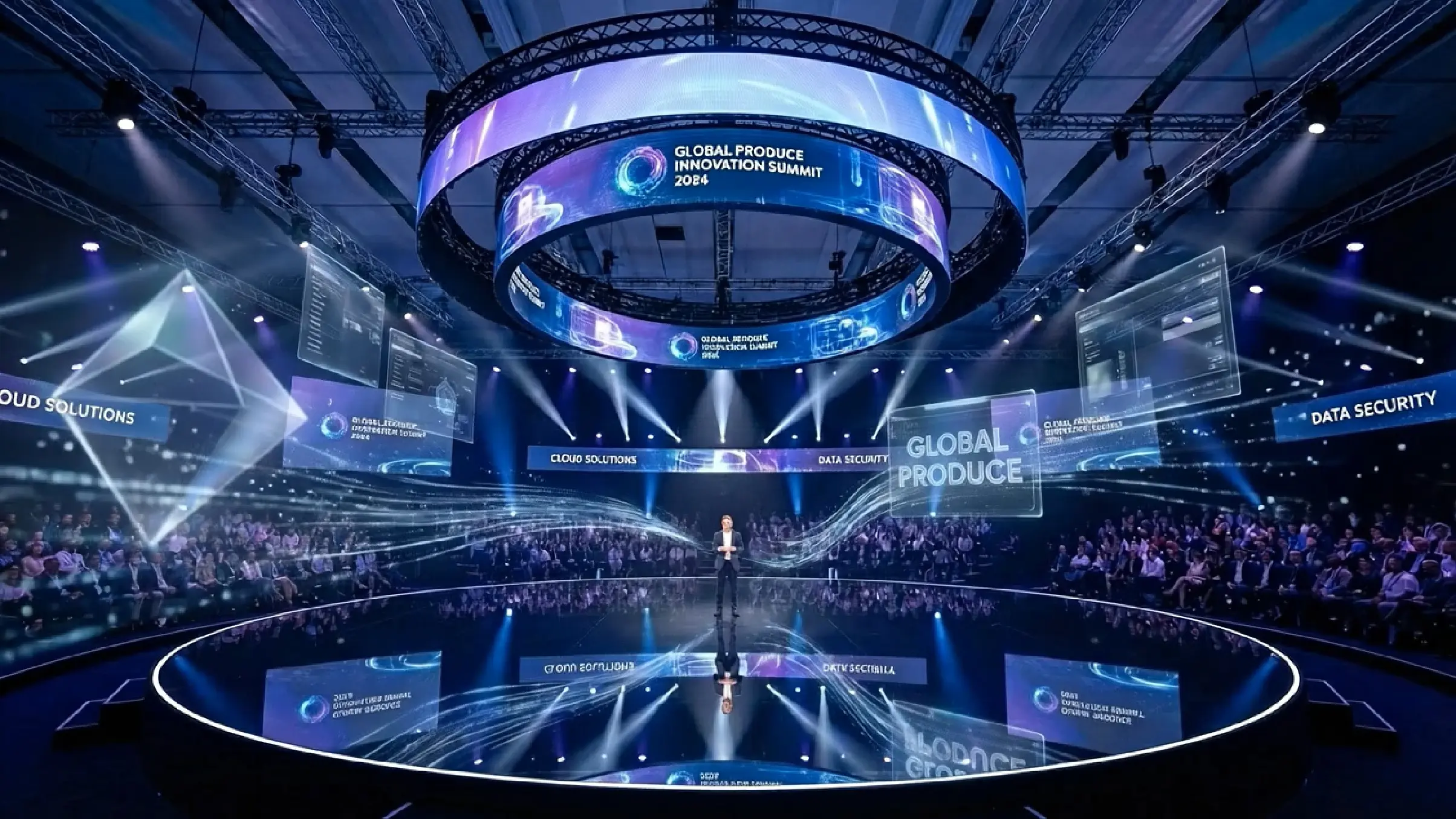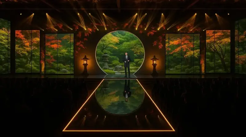 モダンな円形ステージと先進的な映像技術を融合させ、視覚的に圧倒するプレゼンテーション空間。揺さぶる観客の心と共鳴するインタラクティブな演出。