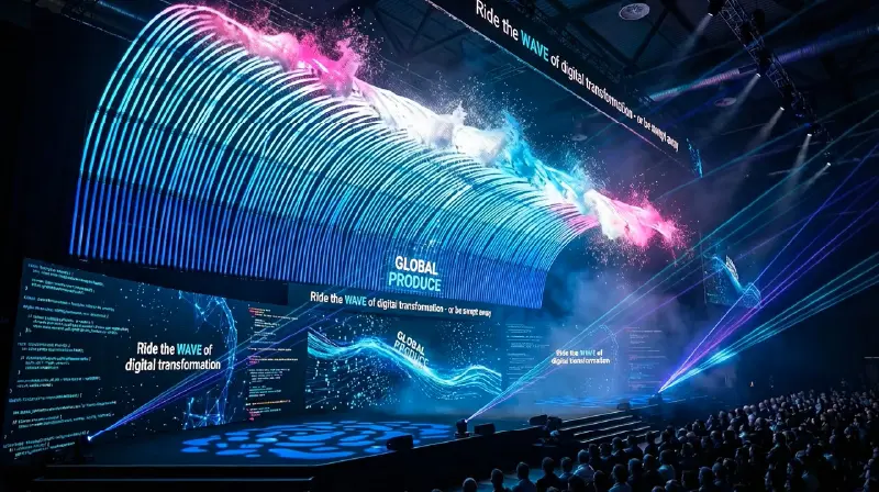 【AIパース】「DXの波に乗る」をステージデザインで表現。スクリーンに巨大なデータの津波を形成し、会場全体を包み込むイメージ。変革の波を「体感」できる、圧倒的なインパクトと明確なメッセージ性の両立を求めた。