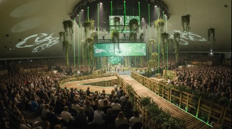 【AIパース】サスティナブル×カンファレンス。自然とテクノロジーが共鳴する、次世代の知の舞台。持続可能性を「語る」のではなく、空間そのものが体現するカンファレンス。自然の生命力と、データが描く未来が重なり合い、GLOBAL PRODUCEならではのスケールとダイナミズムで、次の時代を立ち上げる。