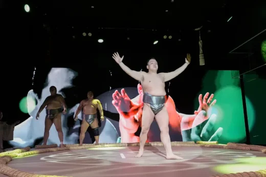 実寸大の土俵ステージと音響・照明・映像演出を備えた大阪・難波の没入型相撲ホール。